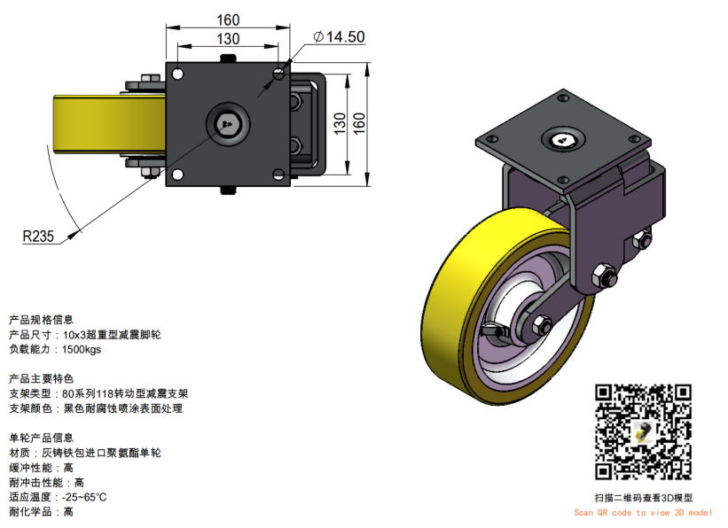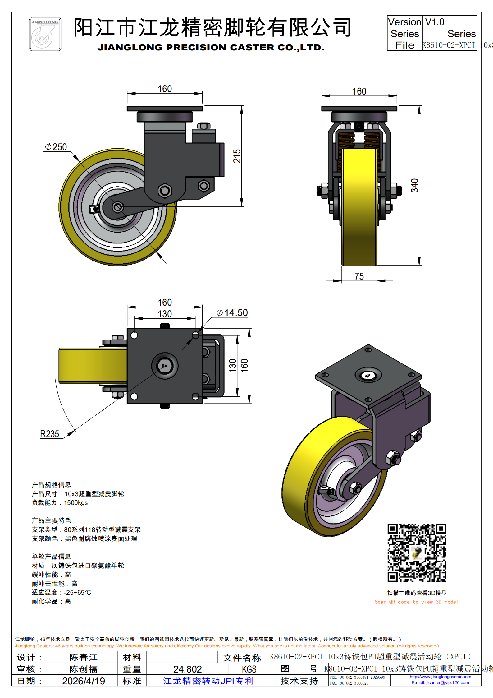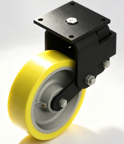 K8610-02-XPCI 10×3 铸铁包 PU 超重型减震万向活动脚轮|工业 AGV 拖车专用自适应双段减震脚轮 产品详情( 优化正文) 江龙脚轮专为超重型物料搬运场景打造外置双段式减震活动脚轮,可适配复杂路况自动调节减震效果,在 500kg–1500kg 超大负载区间实现稳定自适应减震。该款 XPCI 系列铸铁包 PU 重型脚轮,大幅提升转向与牵引行驶稳定性,有效削弱运输共振、避免货物跌落,广泛适用于智能 AGV 小车、工业拖车、重型仓储物流及重载搬运设备,为企业物料安全转运与高效作业提供可靠支撑。